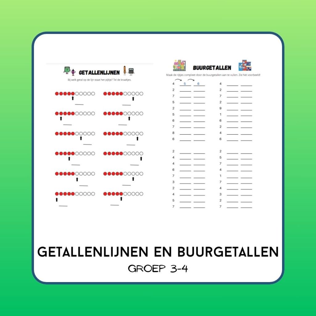 In dit pakket vind je werkbladen om het getalbegrip in groep 3-4 te automatiseren. Onderdelen zijn: getallenlijnen tot 10, buurgetallen tot 20 en 100 (heen en terug tellen).