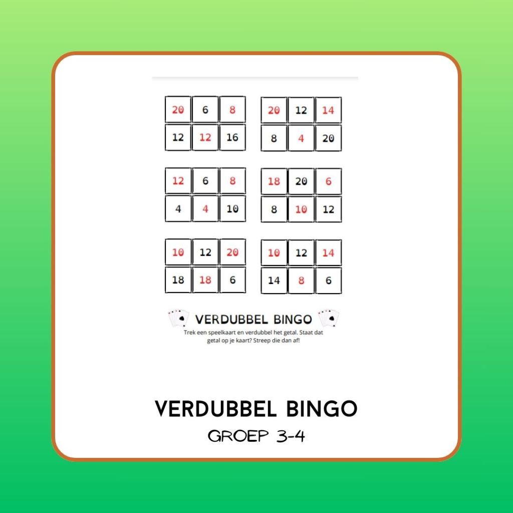 Trek een kaart uit een kaartspel (of digitaal op het digibord). Verdubbel vervolgens het getal en streep ‘m af op de bingokaart. Leuk in tweetallen of om en om.
