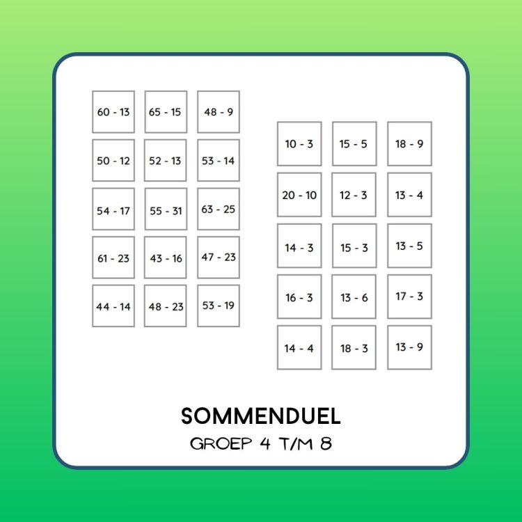 Met dit spel spelen twee of meer spelers tegen elkaar. Reken de sommen uit en kijk welke uitkomst het hoogst is. Diegene mag beide kaartjes hebben.