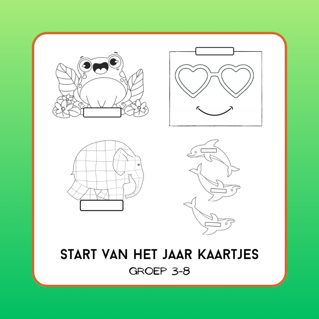 Deze naamkaartjes kun je op de deur of het raam plakken in de eerste week. Ik heb er voor gekozen om er kleurplaten van te maken zodat de kinderen hun eigen naamkaartje kunnen maken en zo gelijk meer eigenaarschap ervaren. De kaartjes komen in vier varianten.