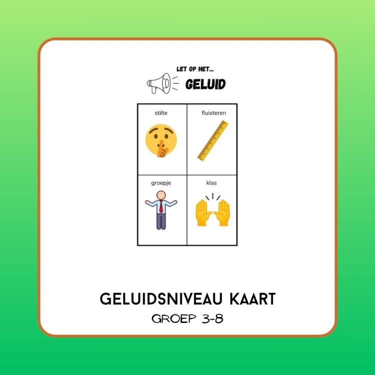 Met deze geluidskaart wordt het geluidsniveau visueel en inzichtelijk gemaakt voor de leerlingen. De leerkracht kan vervolgens het gebaar maken dat bij het type geluid hoort. Stilte (vinger op de lippen): je bent stil. Liniaalstem (handen 30 cm uit elkaar): je buur kan je horen, de rest niet. Groepjesstem (handen een meter uit elkaar): je groepje kan jou horen, de rest niet. Groepsstem (handen omhoog): je mag je normale praatstem gebruiken.
