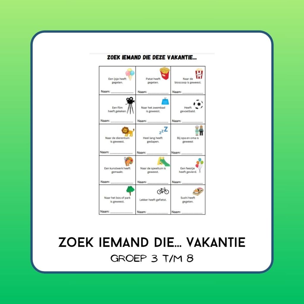De leerlingen lopen rond door de klas op zoek naar iemand die… heeft gezwommen, heeft gelogeerd, heeft gevoetbald of… Een leuke activiteit voor na een vakantie in twee varianten.