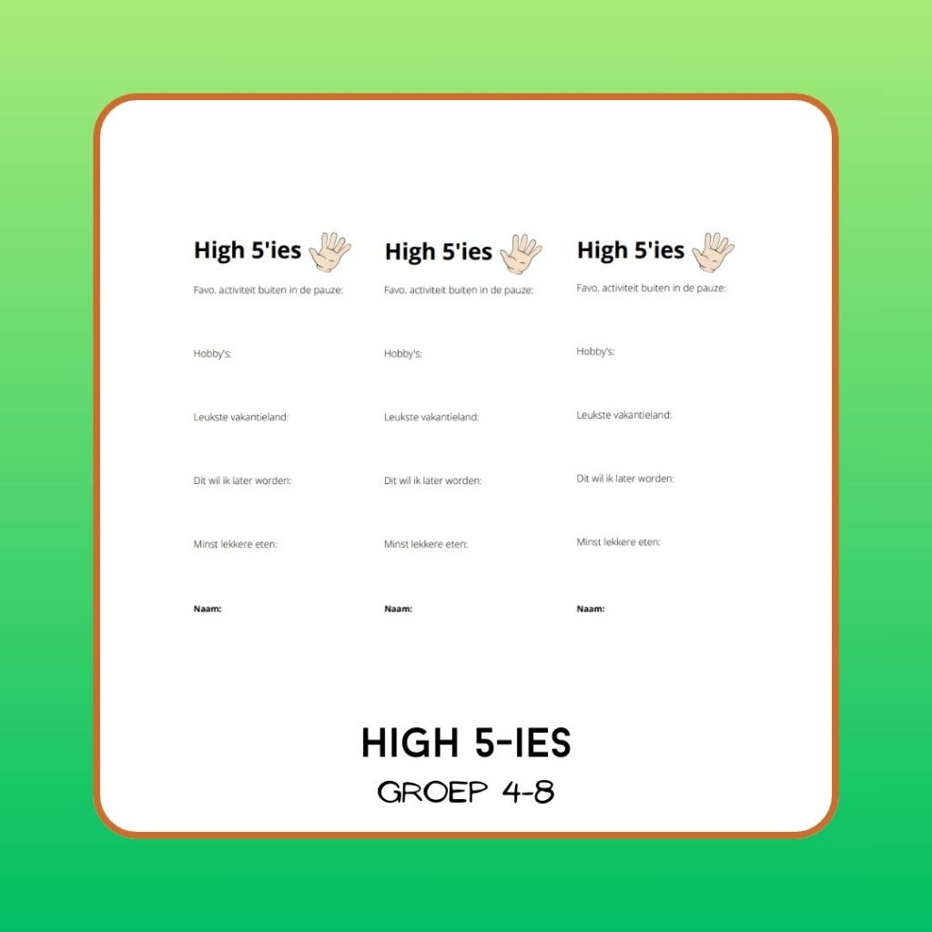 De High 5’ies zijn in te zetten als korte kennismakingsactiviteit: vijf vragen beantwoorden in 5 minuten. De blaadjes worden vervolgens opgehaald, waarna de docent ervoor kan kiezen om een aantal voor te lezen zodat de klas kan raden bij wie dat kaartje hoort. In totaal heb ik vijf kaartjes samengesteld met daarop 25 vragen.