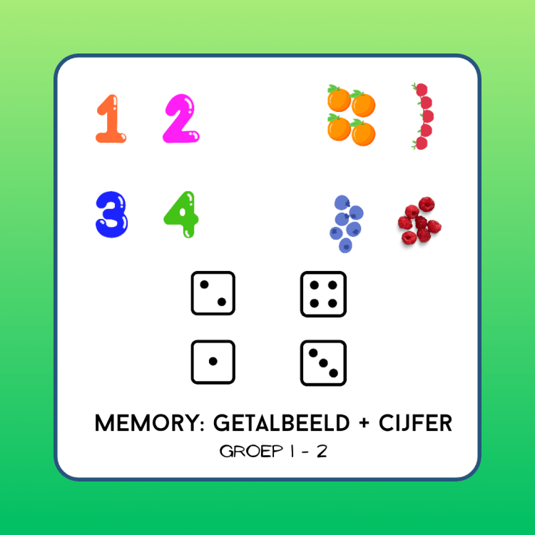 Een memory in drieluik: link het getal aan het juiste getalbeeld en/of het juiste aantal. Ook in te zetten bij een coöperatieve of actieve werkvorm.