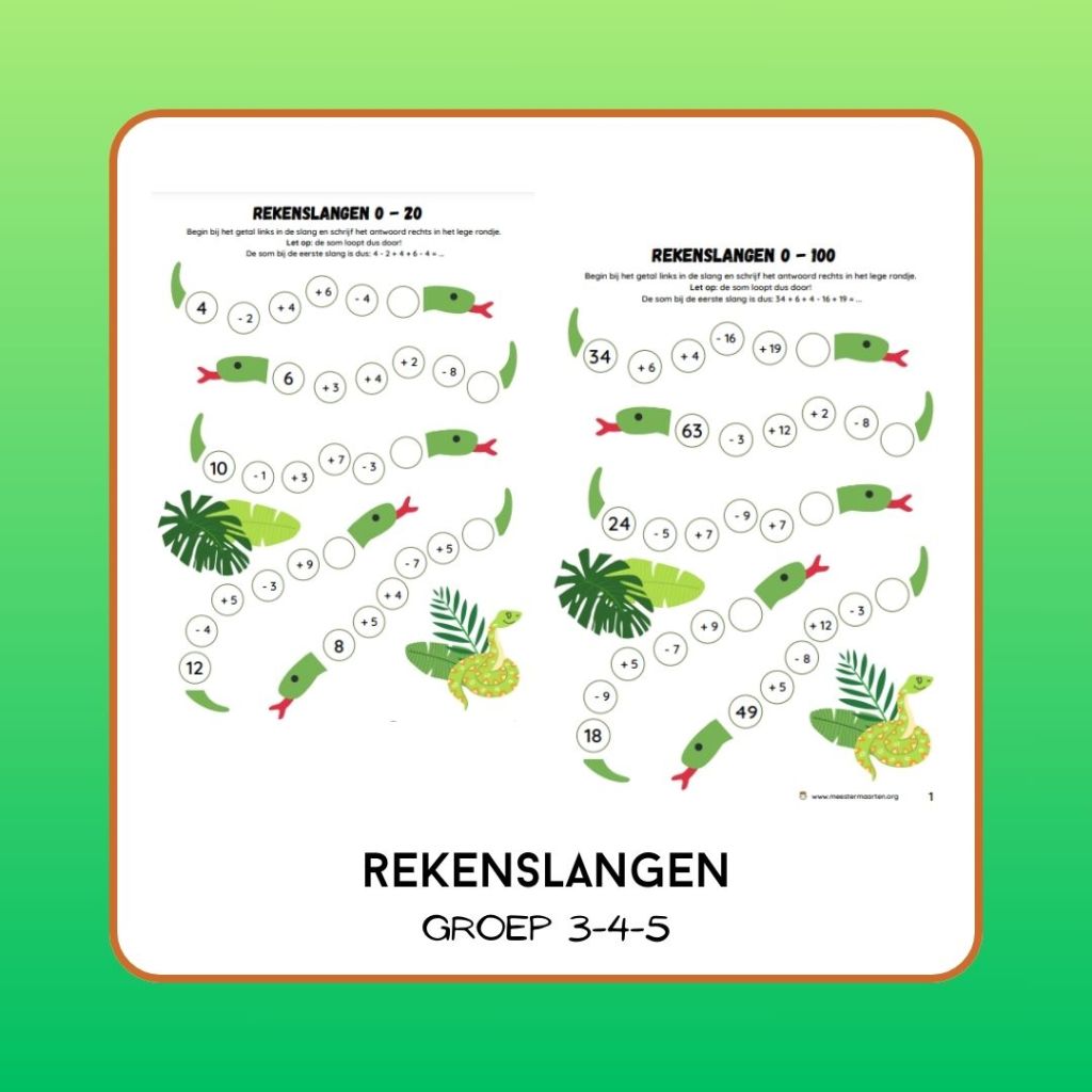 Oefen met plus- en minsommen 0- 20 of 0- 100 met de rekenslangen. Eén bestand met 15 slangen van 0-20 en 15 van 0-100.
