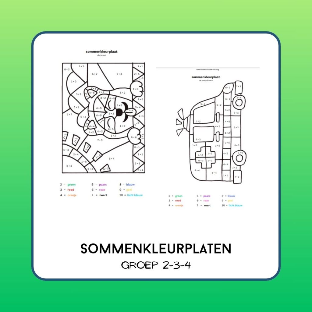Reken de som uit en kleur het vakje in de aangegeven kleur. Voor groep 2-3 met de woorden in kleur.