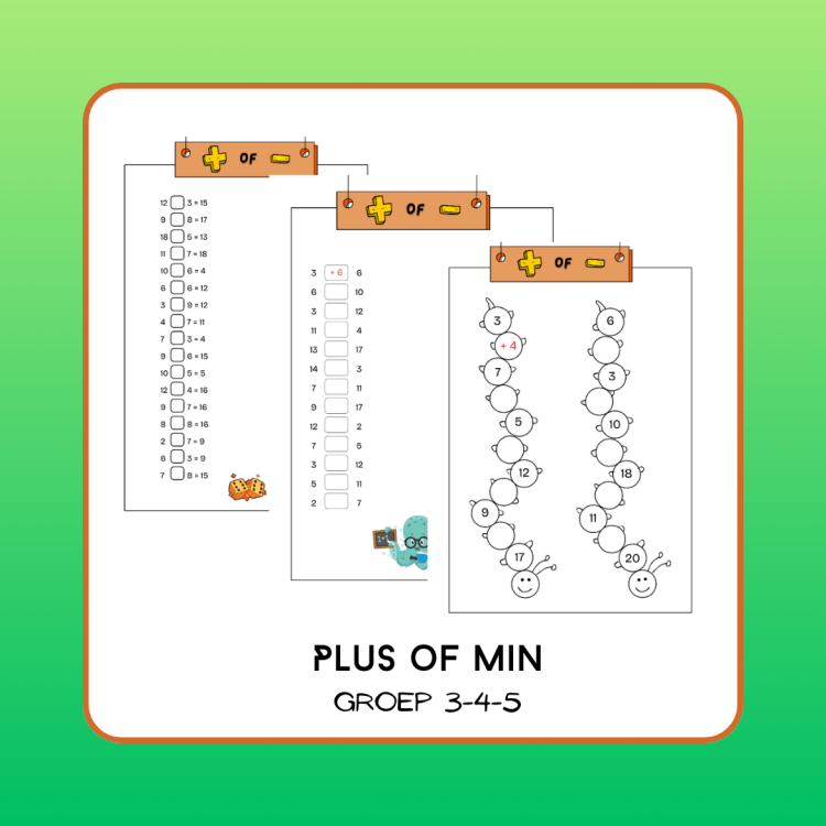 Is het plus… of is het min?! Met deze werkbladen (oplopend in moeilijkheid) oefenen de leerlingen met plus- en minsommen door te kijken welk van de twee tekens nodig is om de som correct op te lossen.