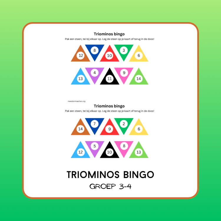 Leg de Triominos stenen met de getallen naar beneden op tafel. Pak een steen en tel de getallen bij elkaar op. Staat dit getal op jouw kaart? Leg de steen dan op het plaatje! Zo niet, leg de steen dan terug op tafel.