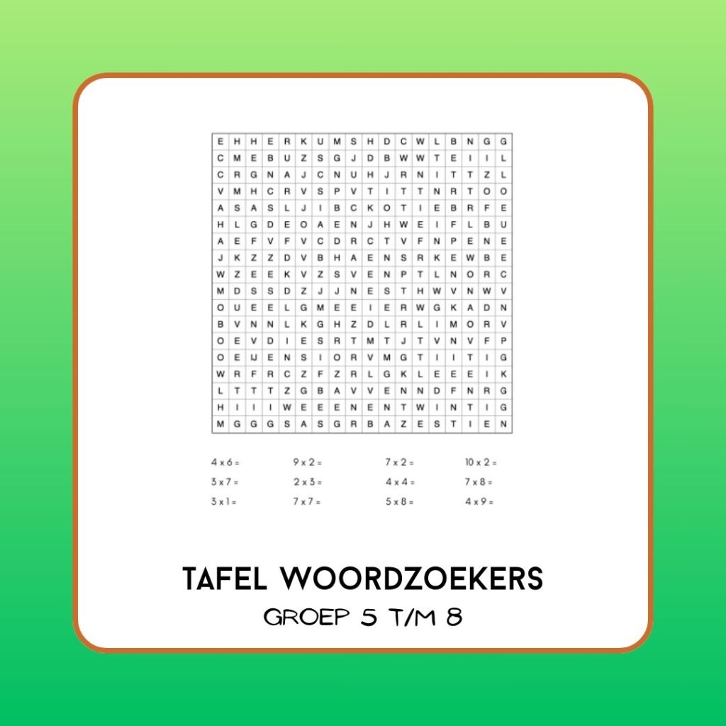 De antwoorden staan al om de vierkanten, maar de getallen van de som ontbreken. Vul de twee getallen in die samen in een keersom het antwoord geven. Bij werkblad 1 hoef je alleen de tafels van 1 t/m 5 + 10 te kennen, werkblad 2 zet in op tafelkennis van 1 t/m 10.