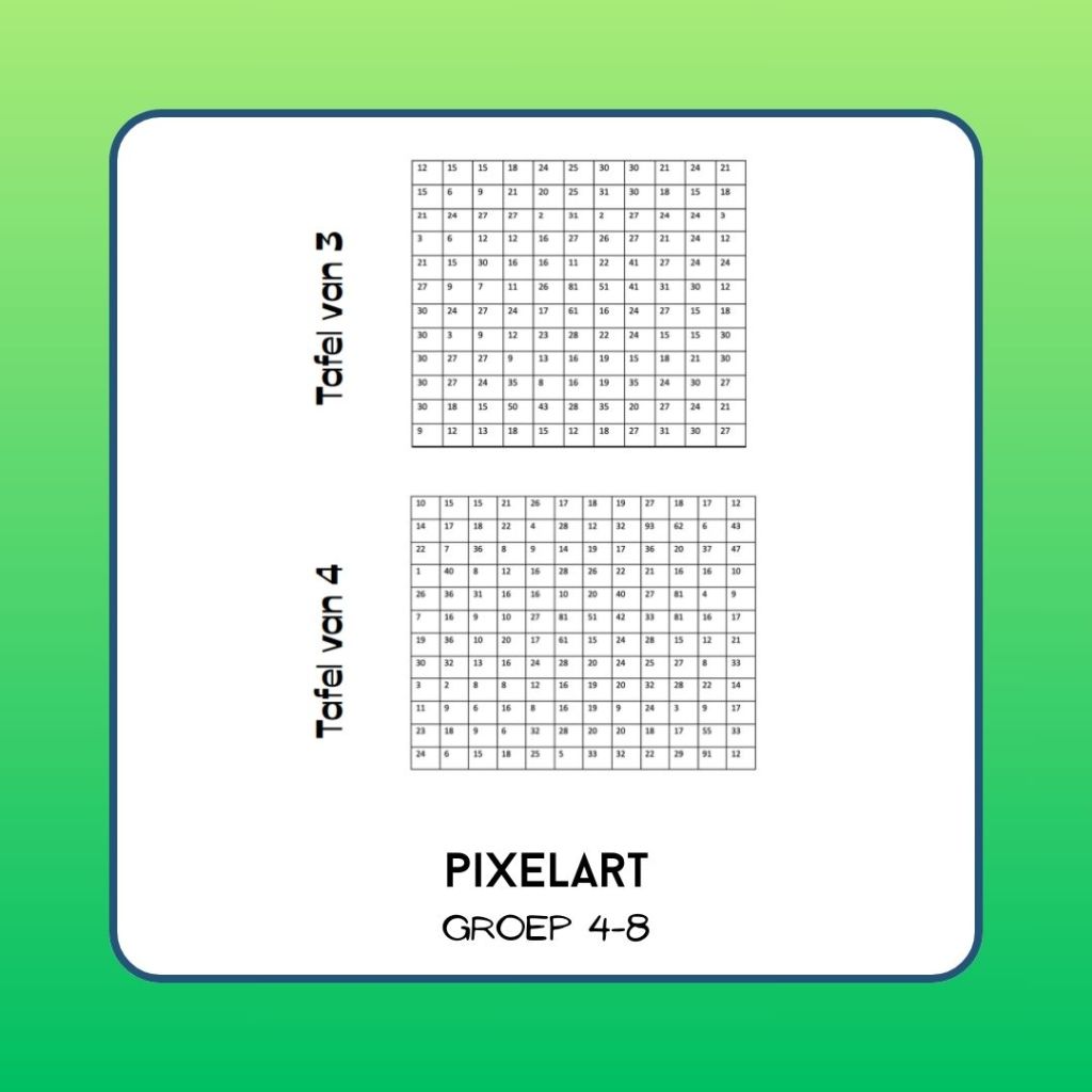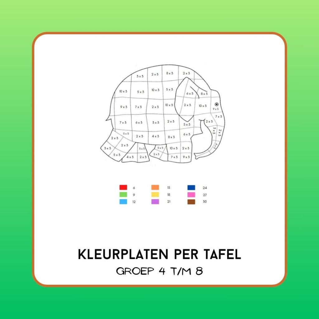 Een kleurplaat per tafel om de tafels van 3, 4, 6 en 7 gericht te kunnen oefenen. Goed te gebruiken als herhaling en extra oefening.