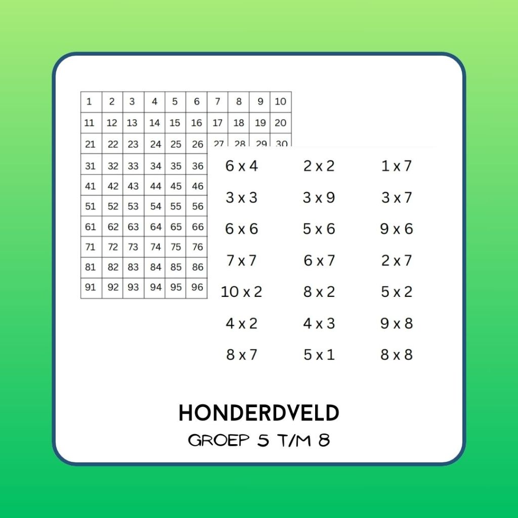 Hang de keersommen op in een begrensd gebied zoals een gang of leerplein. De leerlingen leggen het honderdveld op tafel, zoeken een som en vullen het antwoord in op het blad. Welke tafel is in zijn geheel terug te vinden in het veld?