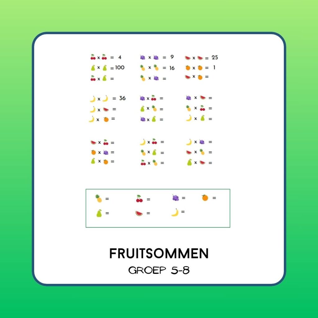 In plaats van een getal staat er een stuk fruit op papier! Welk getal hoort bij welke fruitsoort?