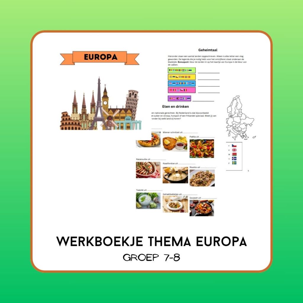 15 pagina’s aan werkbladen over landen, vlaggen en hoofdsteden, maar ook Europese gerechten, bezienswaardigheden en een stuk over de EU. Doelgroep 7/8.