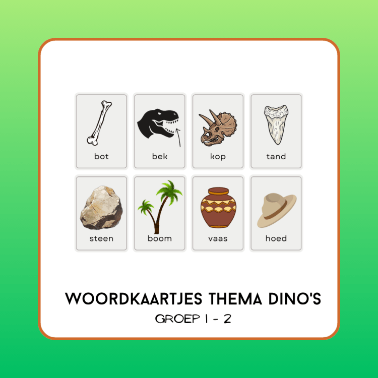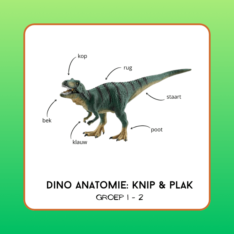 Op het plaatje staat de dino met tekst. De kinderen krijgen een plaatje zonder de tekst, en een rijtje woorden om uit te knippen. Zij kijken goed welk woord waar moet staan volgens het voorbeeld.