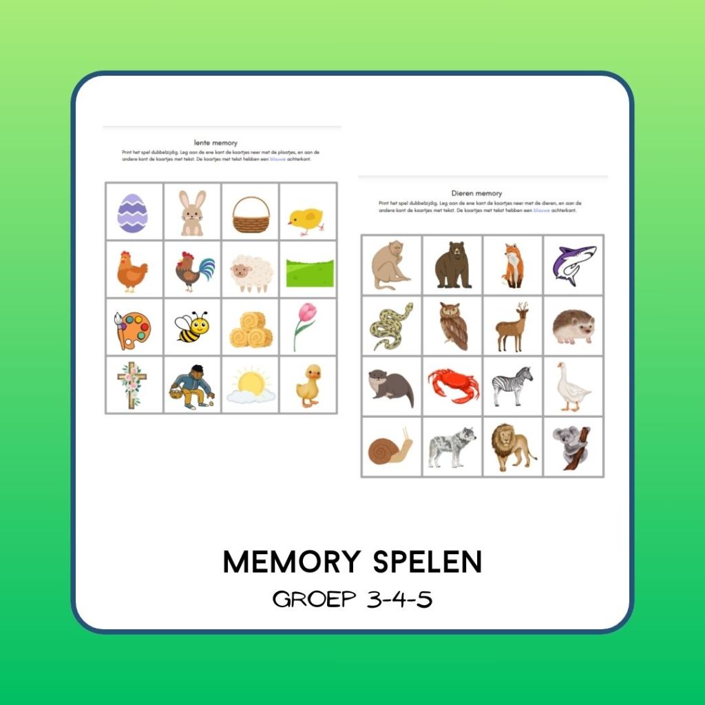 Met het memory spel kunnen leerlingen spelenderwijs nieuwe woorden binnen een thema leren. Aan de ene kant liggen kaartjes met woorden, aan de andere kant met plaatjes. Wanneer een leerling het juiste woord bij het plaatje vindt, heeft diegene een punt.