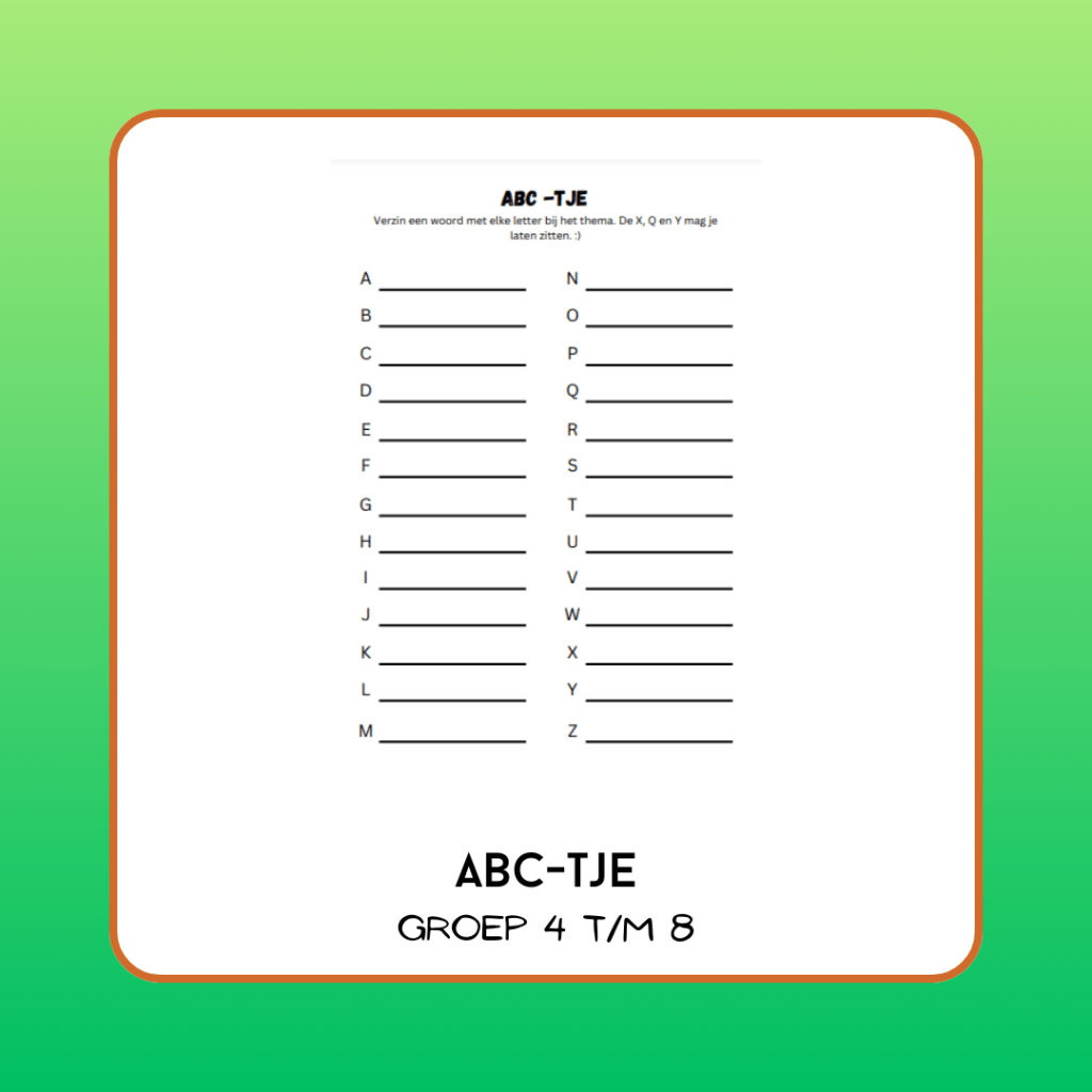 Het ABC-tje spreekt voor zichzelf: verzin een woord binnen het thema met elke letter van het alfabet. Bijvoorbeeld thema dieren, het ziekenhuis, verkeer, weer, landen, tweede wereld oorlog, etc.